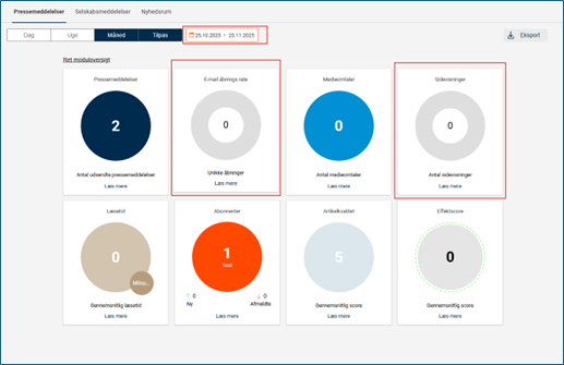 Det er for dig særligt relevant at se på ”e-mail åbningsrate” og ”sidevisninger” (markeret med rød på billede 25). Også markeret, er en dato øverst på siden, som kan justeres for at vise tal fra en periode efter dit valg: