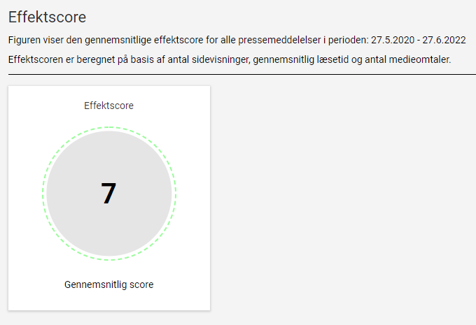 I modulet Effektscore kan du se en gennemsnitlig effektscore for alle pressemeddelelser I har sendt ud i tidsperioden, eller for den enkelte pressemeddelelse.