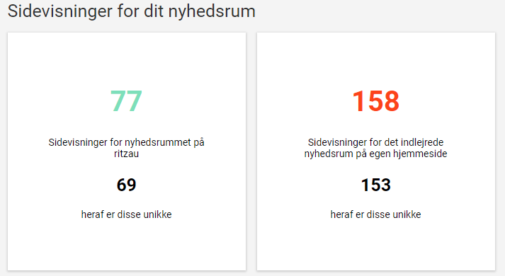 Det første der vises er tal på sidevisninger i henholdsvis nyhedsrum på Via Ritzau og det indlejrede på jeres egen hjemmeside.