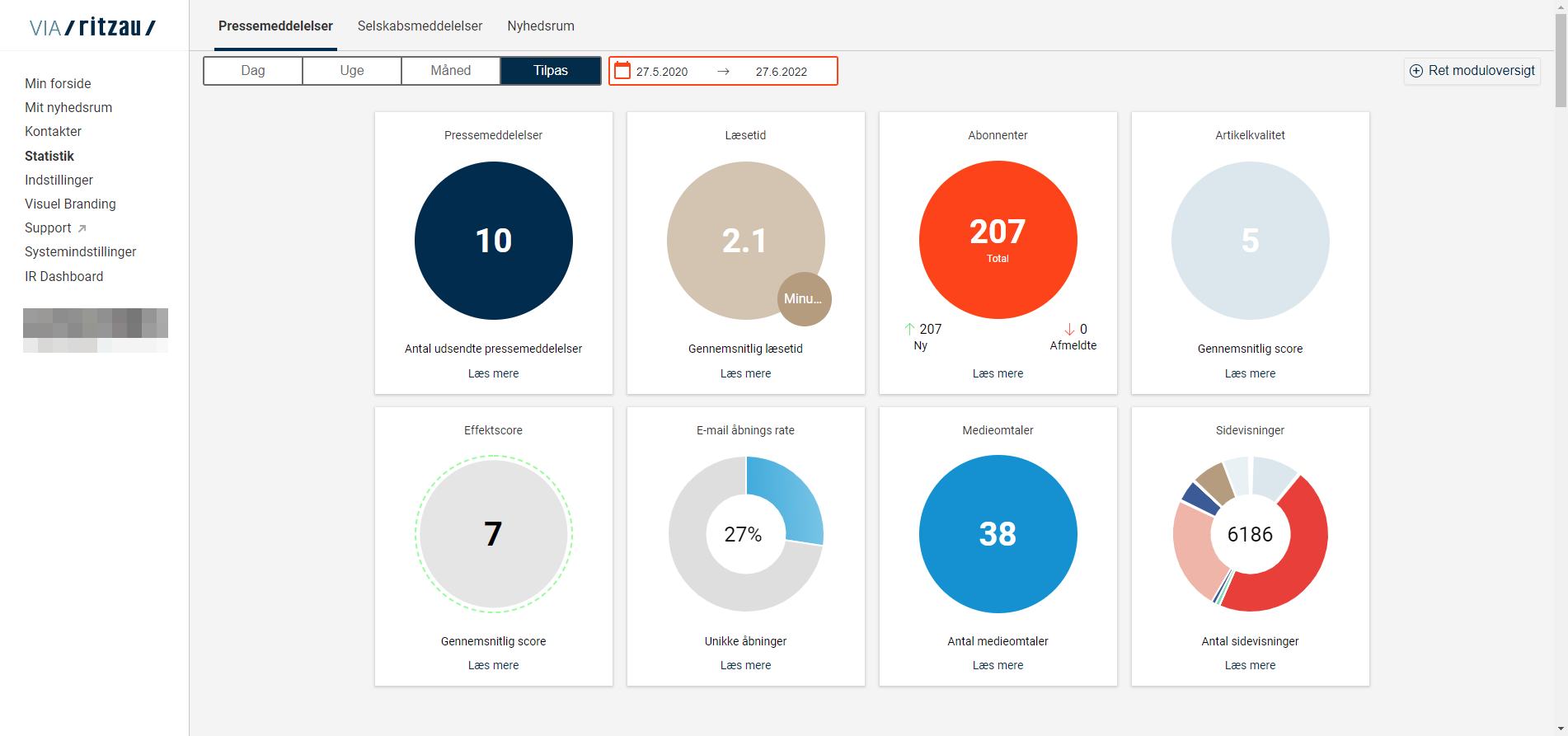 I menuen [pressemeddelelser] kan du se statistik over alle udsendte pressemeddelelser.