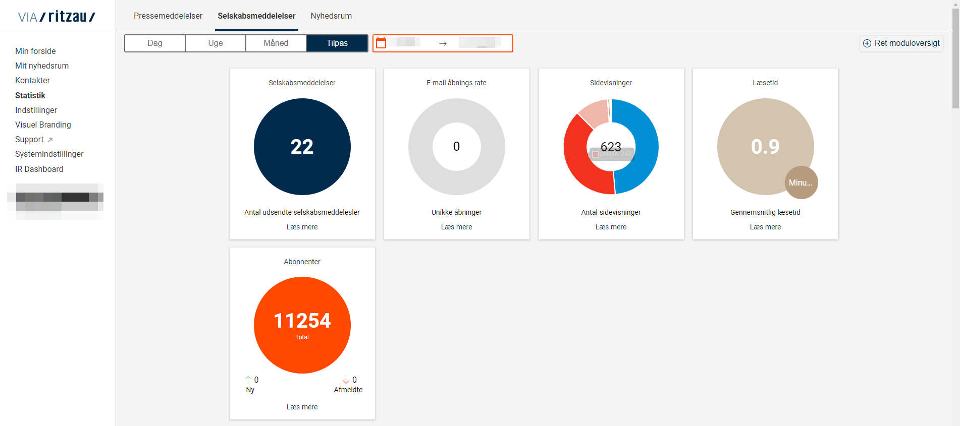 I menuen [selskabsmeddelelser] kan du se statistik over alle udsendte pressemeddelelser.