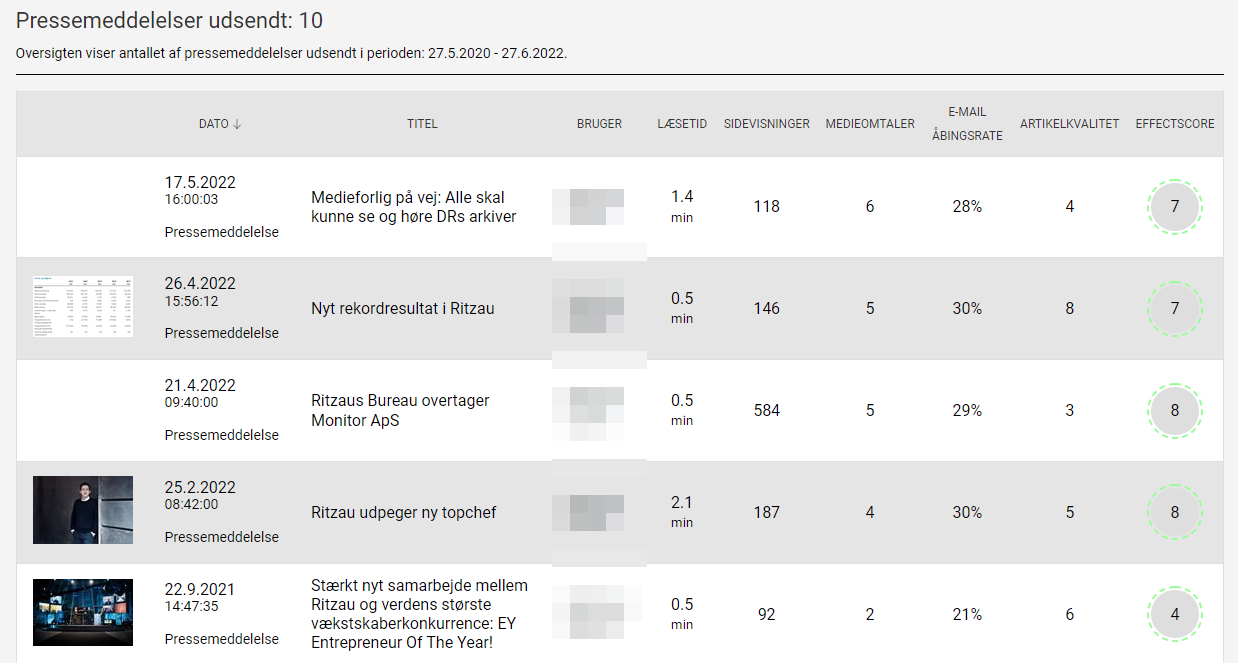 Home / g) Statistik / Statistik – Antal af udsendelserStatistik – Antal af udsendelser Oversigten over udsendte pressemeddelelser eller selskabsmeddelelser, der er udsendt inden for den givne tidsperiode. Det er muligt at klikke på den enkelte pressemeddelelse/selskabsmeddelelse og få statistik kun for den.