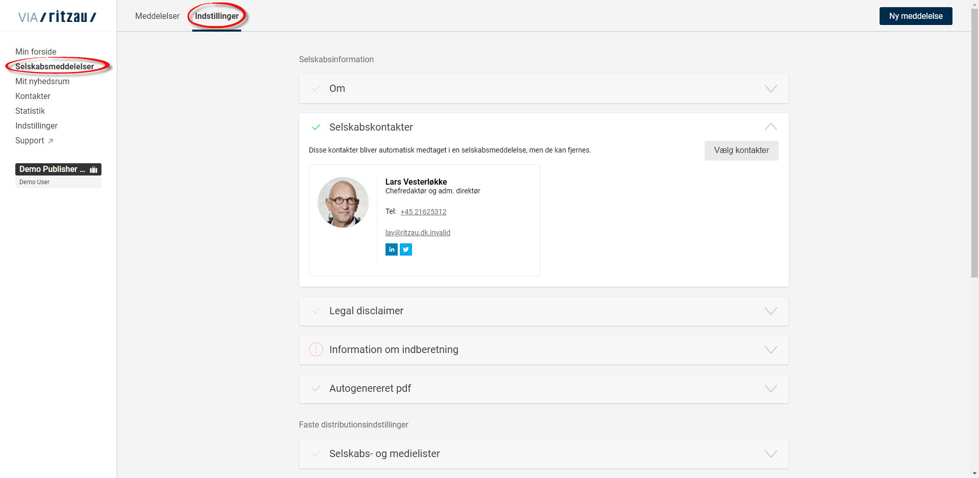 Via Ritzau -> [Selskabsmeddelelser] -> [Indstillinger] -> [Selskabskontakter]