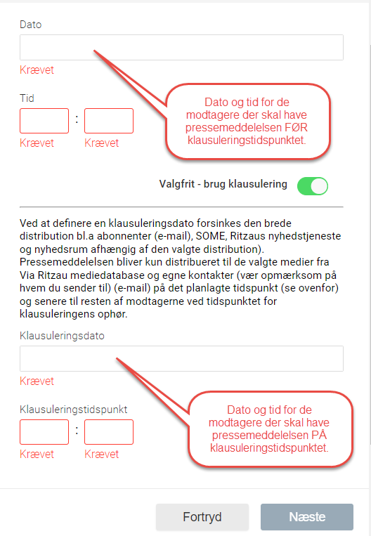 Klausuleringstidspunktet skal være mindst 1 time senere end udsendelsestidspunktet – om pressemeddelelsen er planlagt eller udsendt med det samme.